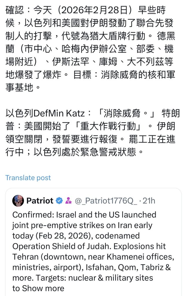 X账号名为patriot(中文:爱国者)发文称:今天(2026年2月28日)早些时候,以色列和美国对伊朗发动了联合先发制人的打击,代号为“犹大盾牌”(另有媒体称“史诗狂怒”)行动。 德黑兰(市中心、哈梅内伊办公室、部委、机场附近)、伊斯法罕、库姆、大不列兹等地爆发了爆炸。 目标:消除威胁的核和军事基地。