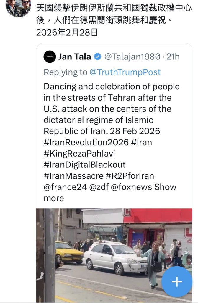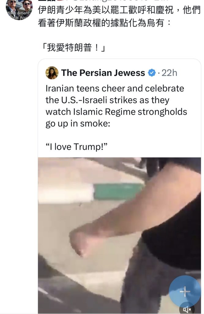 在美、以军队空袭伊朗过程中,不断有人传来世界各地伊朗人民欢呼雀跃,并拍手称赞川普总统的视频。