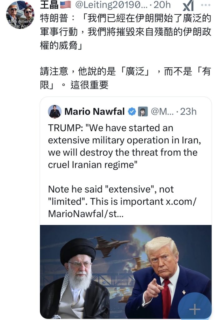 特朗普:「我们已经在伊朗开始了广泛的军事行动,我们将摧毁来自残酷的伊朗政权的威胁」