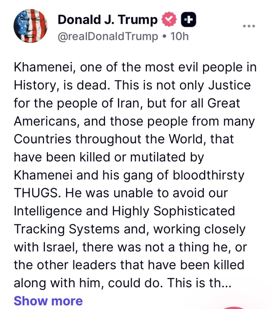 下午14时11分许,川普总统在他的TruthSocial 社交媒体发文称:历史上最邪恶的人之一哈梅内伊死了。 这不仅是伊朗人民的正义,也是所有伟大的美国人,以及那些被哈梅内伊和他的嗜血暴徒團伙杀害或殘害的人的伟大美国人。 他无法躲避我们的情报和高度复杂的跟踪系统,与以色列密切合作,他或其他和他一起被杀的领导人无能为力。 这是伊朗人民夺回国家的最大机会。 我们听说,他们的许多伊斯兰革命卫队、军队以及其他安全和警察部队不再想战斗,正在向我们寻求豁免权。 正如我昨晚所说,“现在他们可以拥有免疫力,以后他们只能得到死亡!” 希望伊斯兰革命卫队和警察将与伊朗爱国者和平融合,作为一个单位共同努力,使国家恢复应有的伟大。 这个过程应该很快就会开始,不仅是哈梅内伊的死亡,而且这个国家在短短一天内就被摧毁了,甚至被消灭了。 然而,大量精确的轰炸将持续,不间断地持续一周,或者只要有必要,以实现我们实现中东和全世界和平的目标!