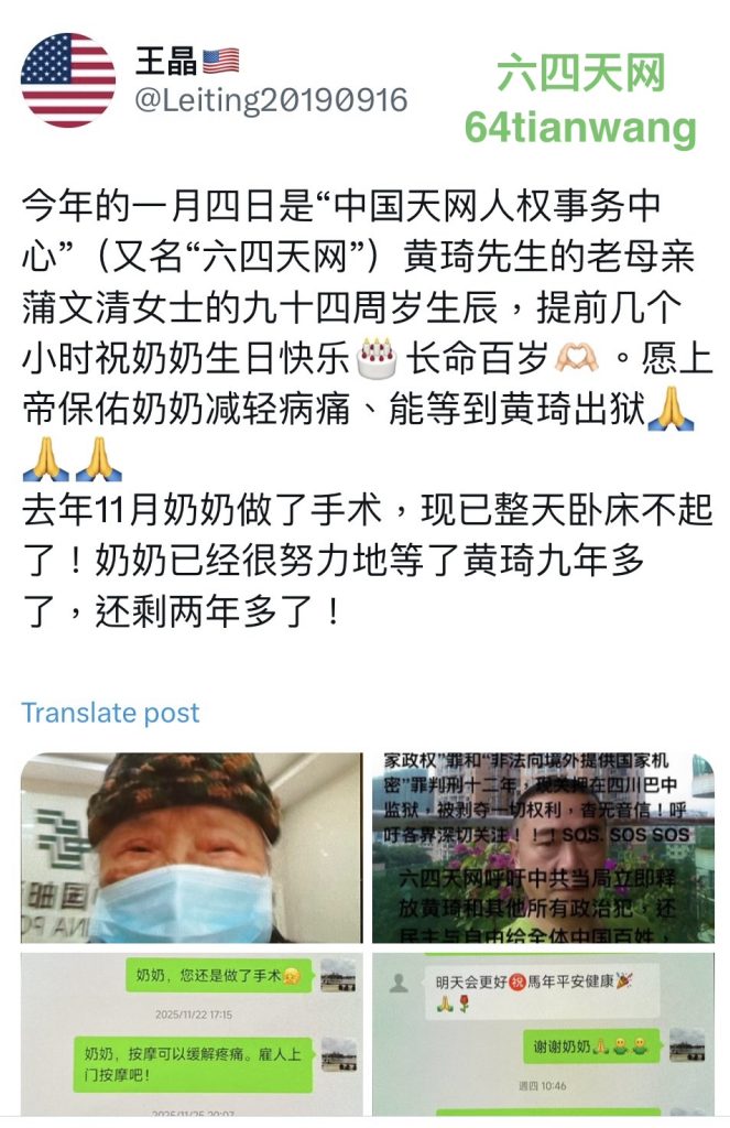 浦奶奶从八十几岁盼黄琦老师早日出狱,如今盼到了九十几岁, 虽然已经是肺癌晚期、身体一天不如一天,可还健在,如果上帝保佑她能再多熬两年, 黄琦老师就刑满释放了!